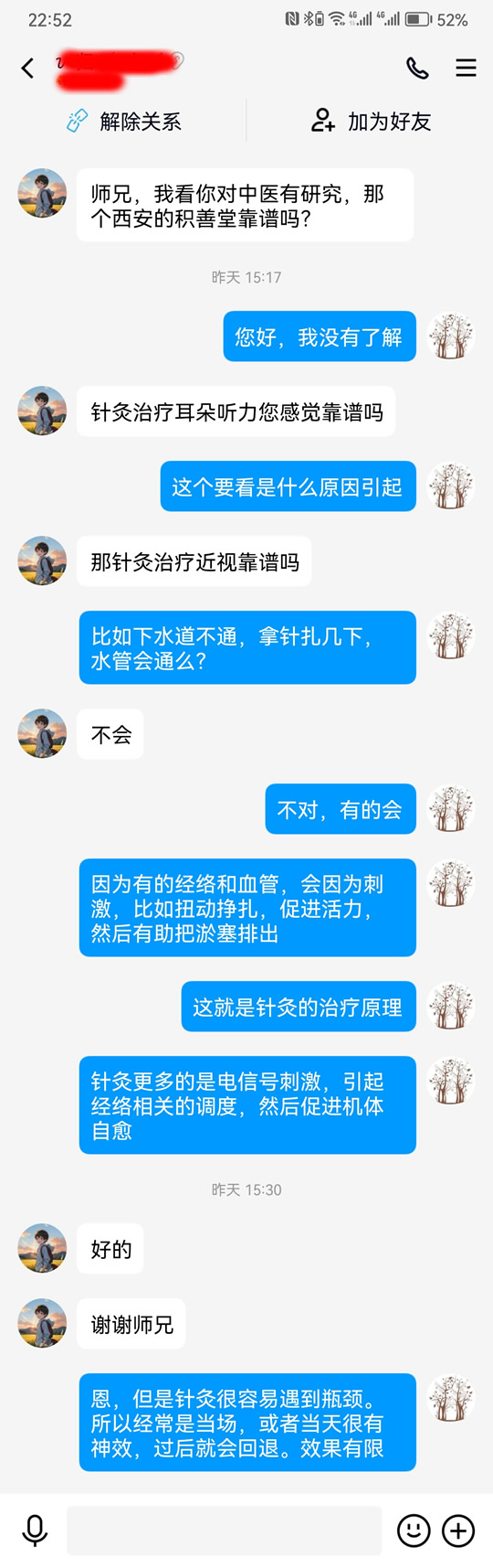 一位同修询问针灸是否可以治疗耳聋和近视,抖音里那些民间针灸高手的视频是否可信。